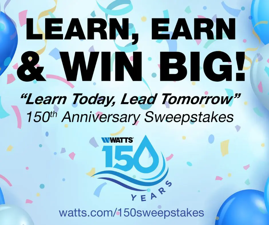 Entering to win couldn’t be easier! Complete any training with Watts – whether online or in-person and earn limited-time only tickets redeemable for prizes. Find out more at: www.watts.com/150sweepstakes