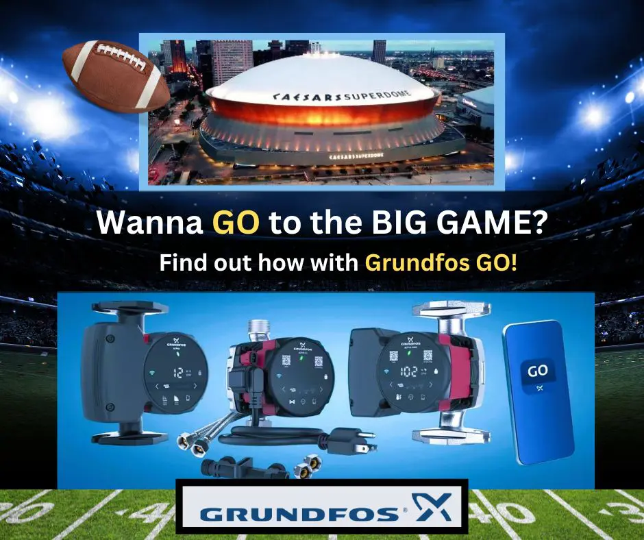 Through November 30, 2024, for every qualified Grundfos hot water recirculation and heating circulator you install and commission using the Grundfos GO app, that’s one chance to enter to win 2 VIP, all-inclusive tickets to the 59th BIG GAME! Find out more here!